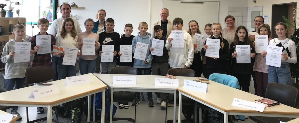 Gruppenbild der WRG-Handballmannschaften (Jungen und Mädchen) vor einem Handballtor in der Sporthalle